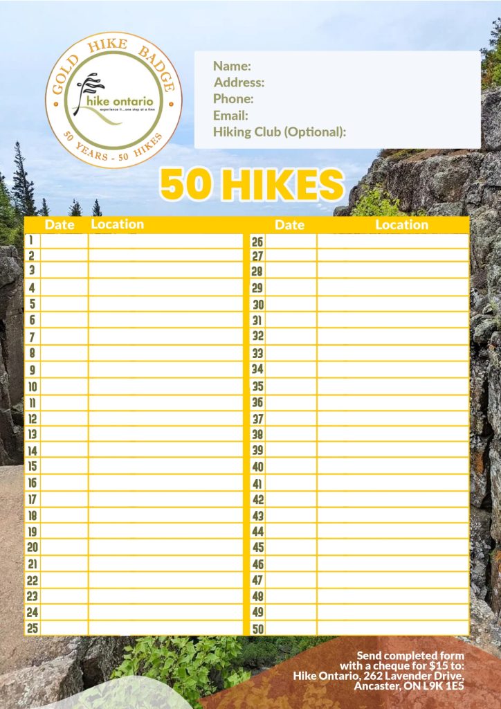 Celebrate the golden anniversary of Hike Ontario (1974-2024) with 50 hikes in our beautiful province and receive a special Gold Hike Badge available only in 2024!